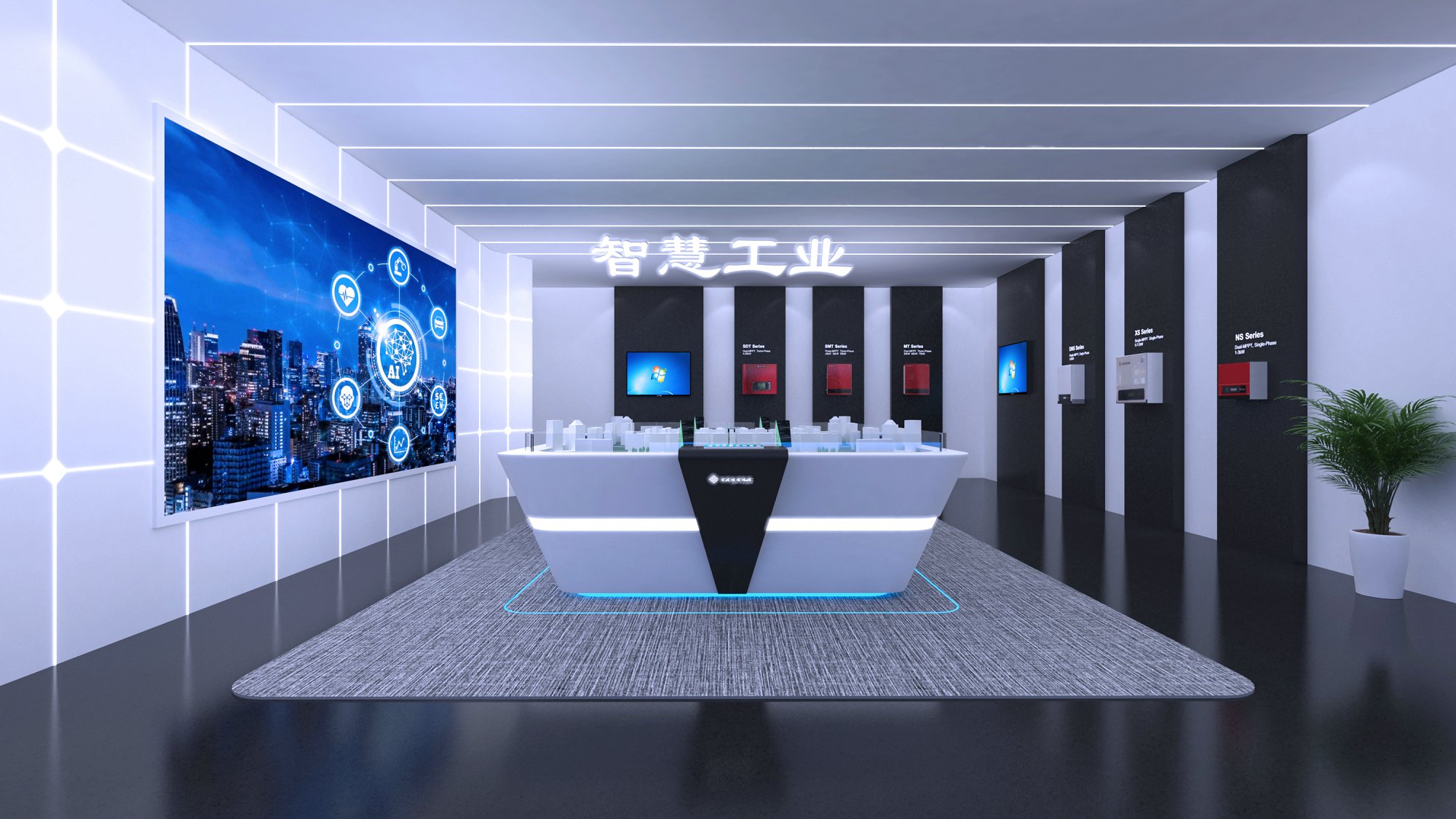 契合固德威的品牌形象和产品特性,采用开放式结构进行合理的分区,再搭配灯具灯光的效果,衬托出展厅大气、豪华的氛围,突出一种简约、时尚的品味。